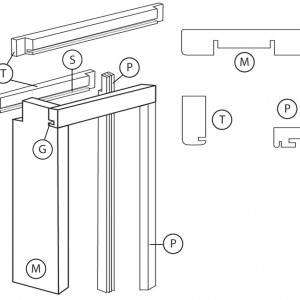 M - montante P - pilastrino T - traverso lungh.2150mm G - guarnizioni in battuta S - spazzolini